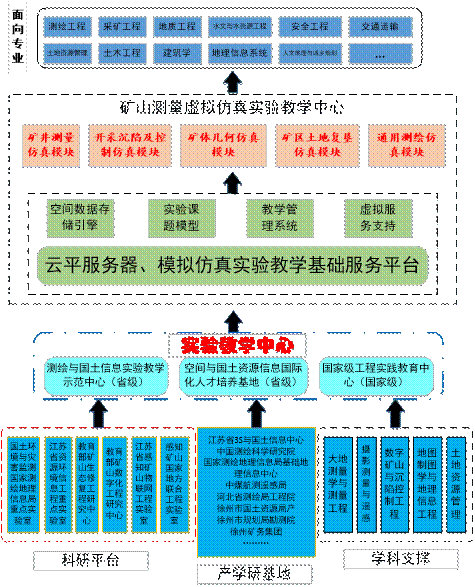 矿山测量国家级虚拟仿真实验教学中心依托江苏省测绘与国土信息实验教学示范中心、测绘科学与技术江苏省一级重点学科和大地测量学与测量工程国家重点(培育)学科,以“战略指引、产学研互动、虚实结合、协同创新”的建设理念,“虚拟实验-企业实践-实践反馈-虚拟改良”的虚拟仿真实验教学可持续发展的建设模式,立足学校优势,建设的开放性虚拟仿真实验教学平台。